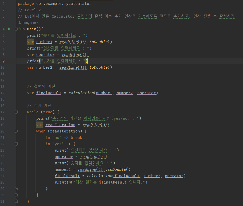 // Lv1에서 만든 Calculator 클래스에 출력 이후 추가 연산을 가능하도록 코드를 추가하고, 연산 진행 후 출력하기