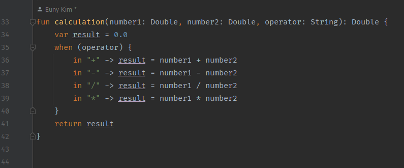 fun calculation(number1: Double, number2: Double, operator: String): Double {