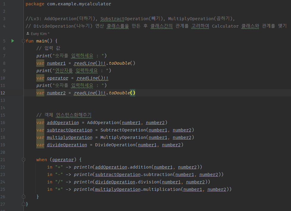 Lv3 : AddOperation(더하기), SubstractOperation(빼기), MultiplyOperation(곱하기), DivideOperation(나누기) 연산 클래스를을 만든 후 클래스간의 관계를 고려하여 Calculator 클래스와 관계를 맺기