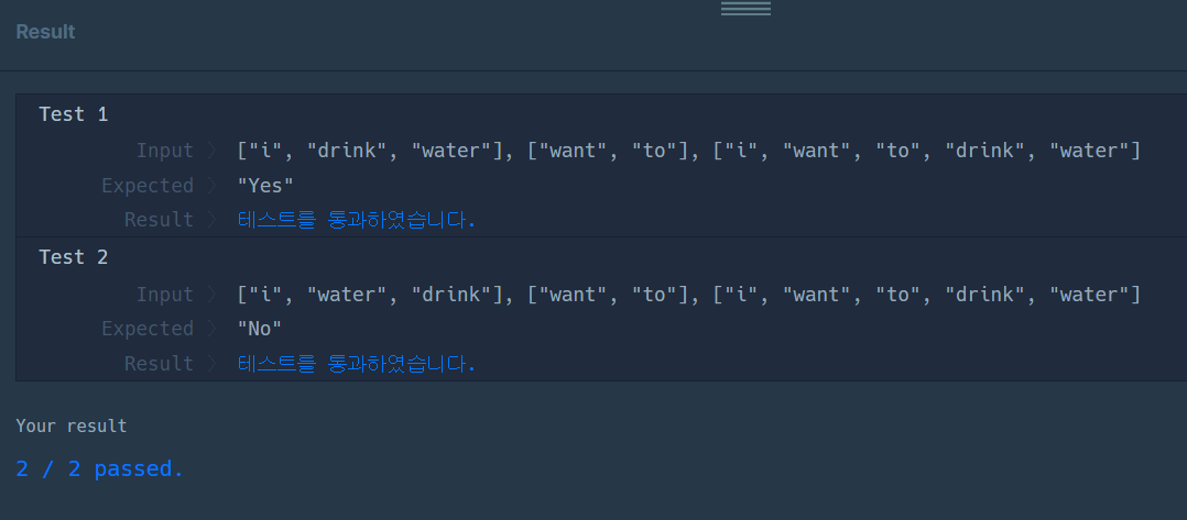 - ๋ง์ฝ ๋๋ค ๋ฌธ์์ด์ด ์ผ์นํ์ง ์๋๋ค๋ฉด No ๋ฌธ์์ด์ ๋ฆฌํดํด์ค๋ค.