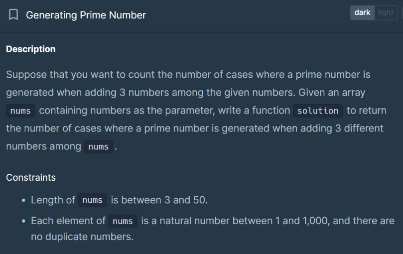 - isPrimeNumber์ด๋ผ๋ ํจ์๋ฅผ ๋ง๋ค์ด ์์๋ฅผ ํ๋ณํด์ฃผ์์ต๋๋ค.